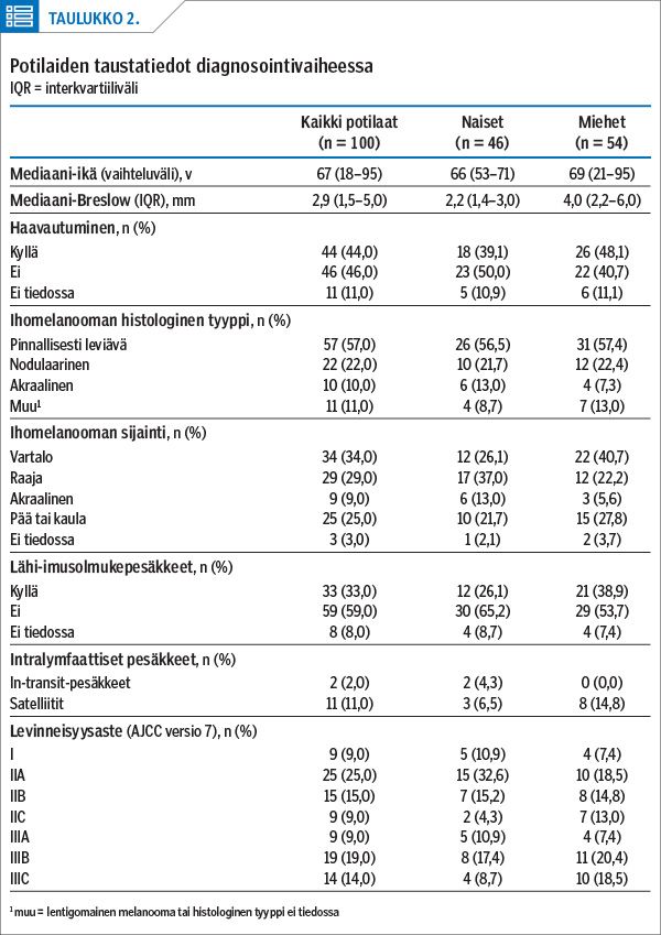 Potilaiden mediaaniseuranta-aika oli 2,9 vuotta (kvartiiliväli 1,4–3,6 v); taustatiedot esitellään taulukossa 2. Miesten melanoomissa todettiin diagnoosivaiheessa enemmän ennustetta heikentäviä tekijöitä. Pinnallisesti leviävä melanooma oli kummallakin sukupuolella yleisin histologinen alatyyppi.