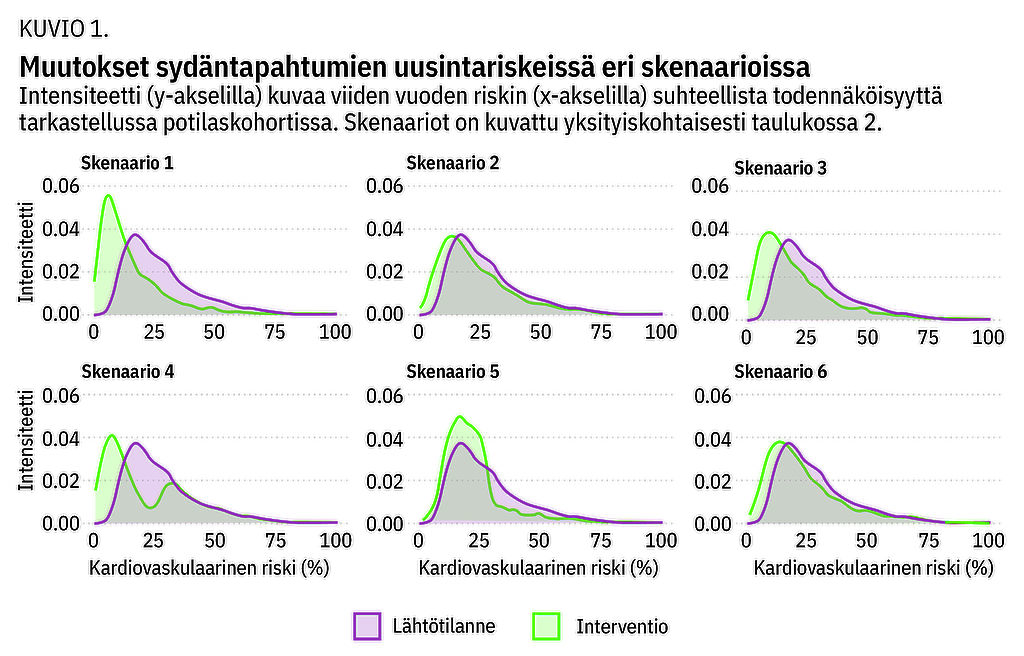 Ennustamisessa käytettiin Euroopan kardiologiyhdistyksen suosittelemaa Smart-Reach-riskityökalua, joka huomioi potilaan uusintatapahtumariskin arvioinnissa myös ikään ja sukupuoleen liittyvän kilpailevan kuolinsyyn riskin ja tuottaa näin uskottavampia ennusteita. Käytössä oli myös tieto siitä, miten ennustettu uusintatapahtumariski vaikuttaa sosiaali- ja terveydenhuollon kumulatiivisiin kustannuksiin viiden vuoden aikana (6). Tarkemmalla kustannuserottelulla erot skenaarioiden välillä voisivat olla vielä suurempia.