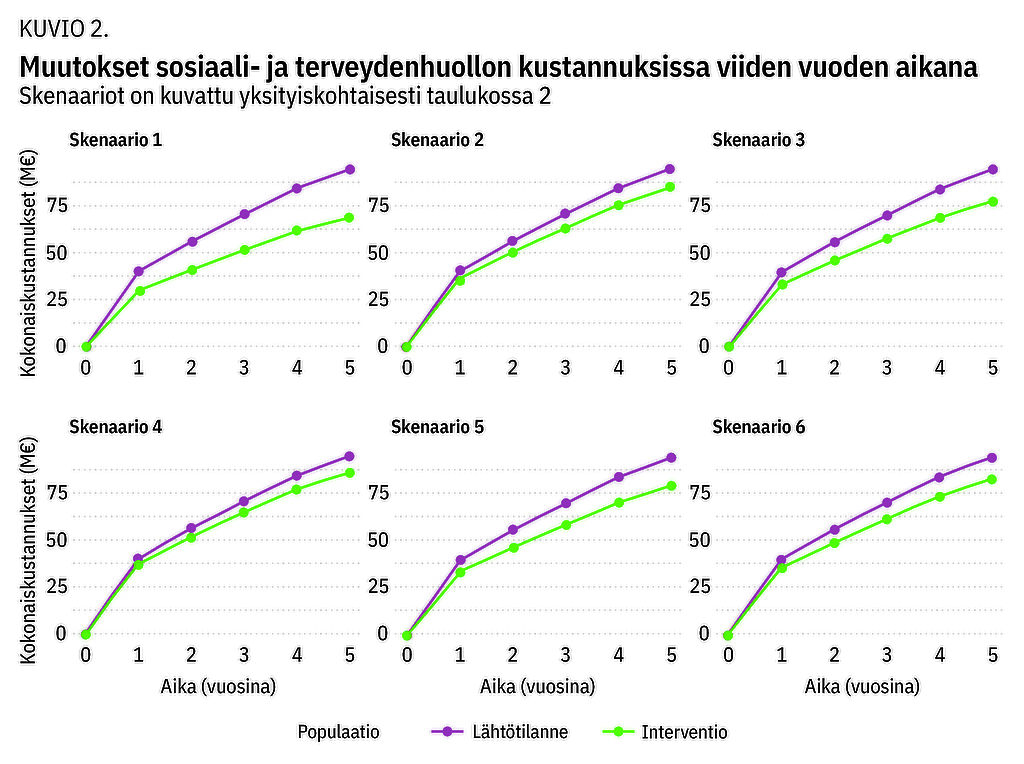 Tulokset Viiden vuoden uusintatapahtumariski oli lähtötilanteessa 28 %, ja terveydenhuollon kokonaiskustannukset olivat 94,3 miljoonaa euroa. Erilaisissa skenaarioissa absoluuttinen uusintatapahtumariski pieneni 4,4–12,3 %-yksikköä, mikä vastaa noin 25,4 miljoonan euron säästöä sosiaali- ja terveydenhuoltokustannuksissa viiden vuoden aikana.