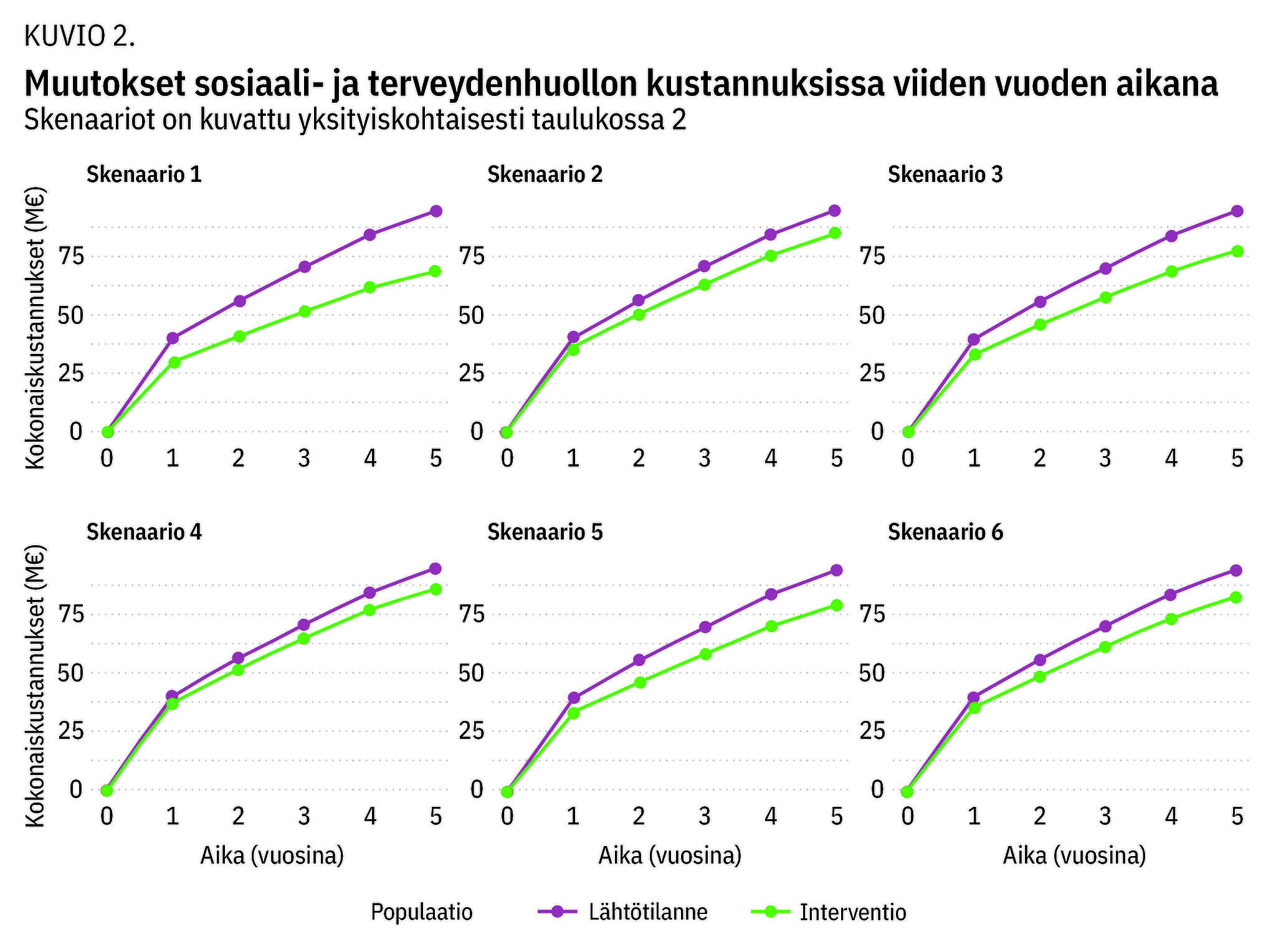 Toisen skenaarion tarkastelussa keskimääräinen uusintatapahtumariski olisi 23,4 % (absoluuttinen riskinalenema 4,4 %), jolloin viiden vuoden kustannukset laskisivat 10 miljoonalla eurolla. Kolmannessa skenaariossa keskimääräinen uusintatapahtumariski olisi 20,0 % (absoluuttinen riskinalenema 7,8 %), ja viiden vuoden kustannukset laskisivat 17,1 miljoonalla eurolla.