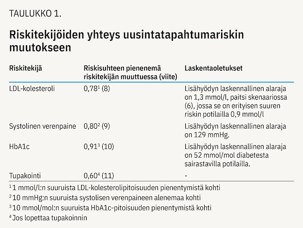 Indeksitapahtuman jälkeisten riskitekijäarvojen yhteys uusintatapahtumariskin muutokseen määriteltiin kirjallisuuden perusteella (taulukko 1). Riskinalenemien oletettiin tapahtuvan riippumattomina toisistaan, riskisuhteen olevan vakio yli ajan ja sen muutoksen vaikuttavan ainoastaan sydän- ja verisuonitautitapahtumien riskiin.