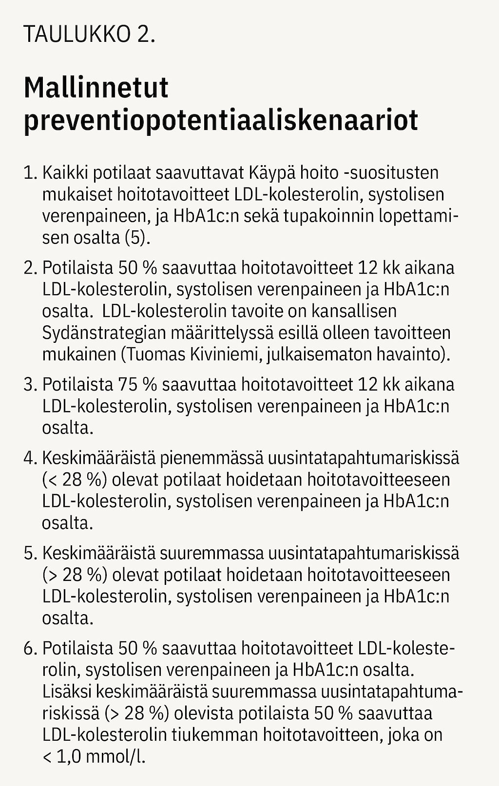 Tarkastelimme useita vaihtoehtoisia skenaarioita, joissa potilaiden oletettiin saavuttavan nykyistä paremmin LDL-kolesterolin, systolisen verenpaineen ja tupakoinnin lopettamisen hoitotavoitteet ja diabeetikoiden saavuttavan HbA1c-hoitotavoitteet. Skenaariot on kuvattu yksityiskohtaisesti taulukossa 2. Potilaat valittiin kohorttiaineistosta skenaarioihin satunnaisesti niiden joukosta, jotka eivät olleet hoitotavoitteessa indeksitapahtuman jälkeen. Analyysit toteutettiin R-ohjelmointikielellä (versio 4.1.2) Valviran hyväksymässä tietoturvallisessa SPESiOR®-käyttöympäristössä.