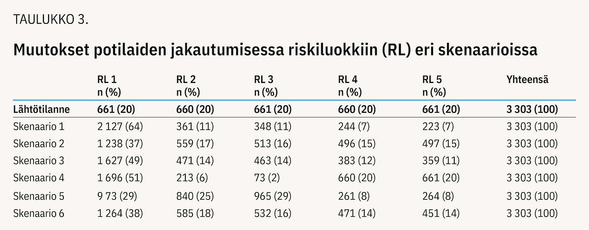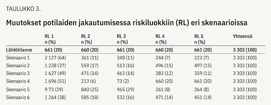 Skenaariomallinnuksen tulokset on kuvattu kuvioissa 1 ja 2. Riskiluokittaiset potilasmäärät eri skenaarioissa esitetään taulukossa 3. Ensimmäisessä skenaariossa keskimääräinen uusintatapahtumariski pieneni viidessä vuodessa 27,9 %:sta 15,5 %:iin (absoluuttinen riskinalenema 12,3 %). Skenaariossa 1 peräti 64,4 % potilaista saavuttaisi alimman riskiluokan (taulukko 3), jossa viiden vuoden uusintatapahtumariski on alle 15,7 %. Viiden vuoden kustannuksissa tämä muutos vastaisi noin 25,4 miljoonan euron laskua lähtötilanteeseen verrattuna.