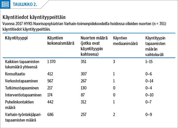 Kun kaikista toimenpidetyypeistä (n = 1 370) vähennetään puhelinkontaktit (n = 442), muiden tapaamisten määräksi jää 928 kappaletta, joista 686 oli työpari-tapaamisia (73,9 %). Tapaamisten lukumäärän mediaani oli 4 (vaihteluväli 1–14) niiden nuorten kohdalla, joiden asioista oltiin yhteydessä muutenkin kuin puhelinkonsultaatiolla ja joiden hoito ei ollut jatkumassa erikoissairaanhoidossa (n = 199). Nuorilla, joihin oltiin yhteydessä muutoin kuin vain puhelinkonsultaation merkeissä, eri käyntityyppien lukumäärä oli yhteensä 276 (mediaani 4, vaihteluväli 1–15). Nuoria, jotka saivat lähetteen erikoissairaanhoitoon (n = 77), ja joilla oli muita käyntityyppikoodeja kuin puhelinkonsultaatioita, tavattiin 5 kertaa (mediaani 5, vaihteluväli 1–15).