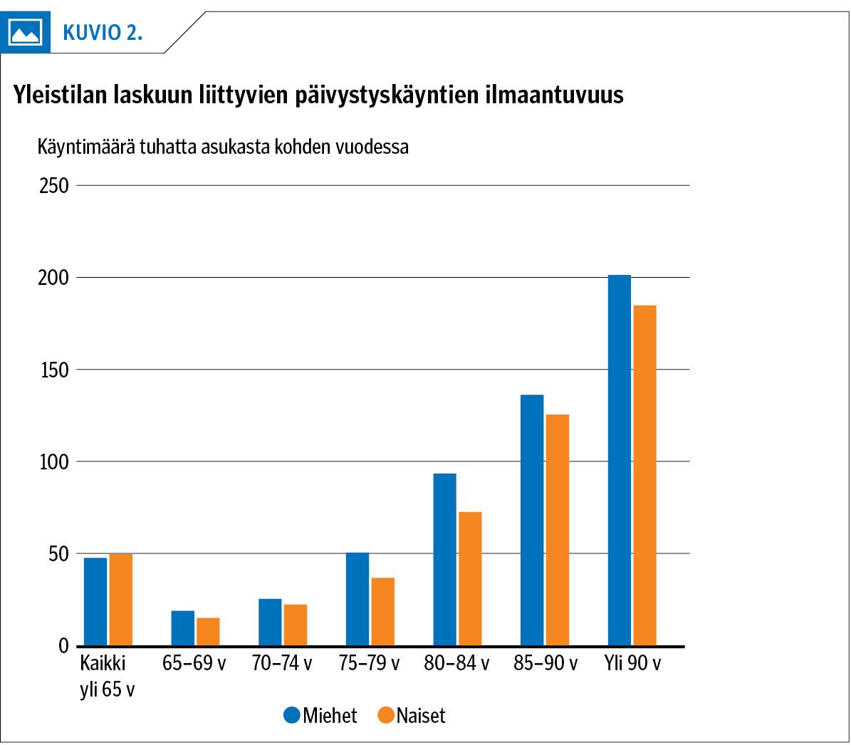 Yleistilan laskuun liittyvät päivystyskäynnit yleistyivät iän myötä (kuvio 2): 65–69-vuotiailla niiden määrä oli 16,6 tuhatta asukasta kohden (10 % käynneistä), mutta yli 90-vuotiailla jo 189 (17,8 % käynneistä).
