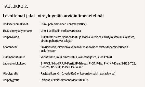 Taulukossa 1 kuvataan idiopaattisen levottomat jalat -oireyhtymän kriteerit, mutta termillä ja diagnoosikoodilla G25.8 kuvataan myös sekundaarista tautimuotoa.