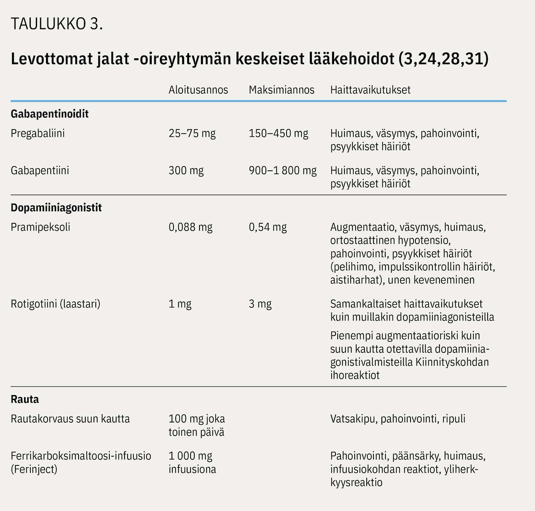 Levottomat jalat -oireyhtymän lääkehoitoa kokonaisuutena on käsitelty aiemmin suomalaisissa katsauksissa (4,7,28). Tässä katsauksessa päivitämme lääkkeiden ensisijaisuutta uusimman tutkimustiedon valossa (taulukko 3).