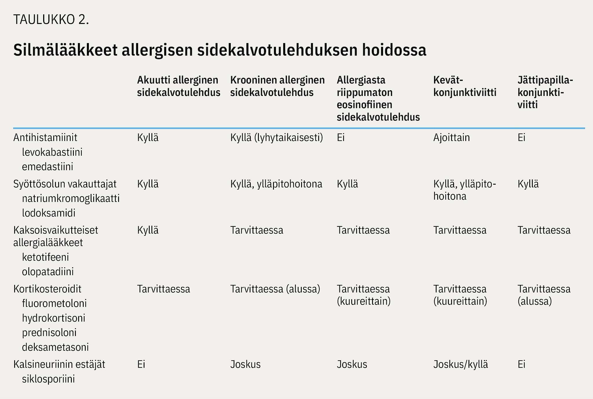 Tässä katsauksessa keskitytään allergiseen sidekalvotulehdukseen, joka jaotellaan akuuttiin ja krooniseen tautimuotoon, kevätkonjunktiviittiin, jättipapillakonjunktiviittiin ja ympärivuotiseen allergiasta riippumattomaan eosinofiiliseen sidekalvotulehdukseen. Tyypillisiä piirteitä, oireita ja löydöksiä sekä eri tyyppien hoitoa kuvataan taulukoissa (taulukko 1 ja 2).