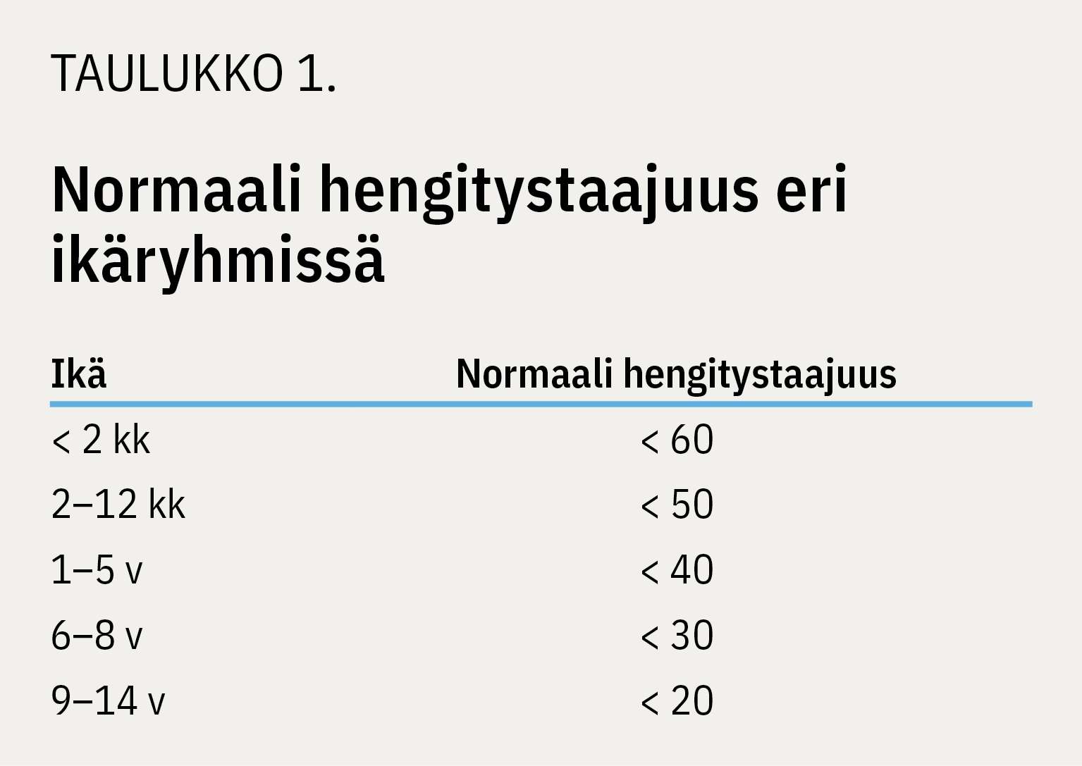 Lapsen normaali hengitystaajuus riippuu iästä. Alle kahden kuukauden ikäisen normaali hengitystaajuus on alle 60 kertaa minuutissa, 2–12 kuukauden ikäisen alle 50 kertaa ja 1–5-vuotiaan alle 40 kertaa minuutissa (taulukko 1). Lisäksi sisään- ja uloshengityksen suhde muuttuu iän myötä. Alle 10-vuotiailla sisään- ja uloshengitys kestävät yhtä pitkään eli suhde on noin 1:1. Sen sijaan yli 10-vuotiailla ja aikuisilla sisään-uloshengityksen suhde on noin 1:2. Sisäänhengitys on aktiivista ja vaatii lihasvoimaa, uloshengitys taas passiivista ja tapahtuu rentouttamalla hengityslihakset (6).