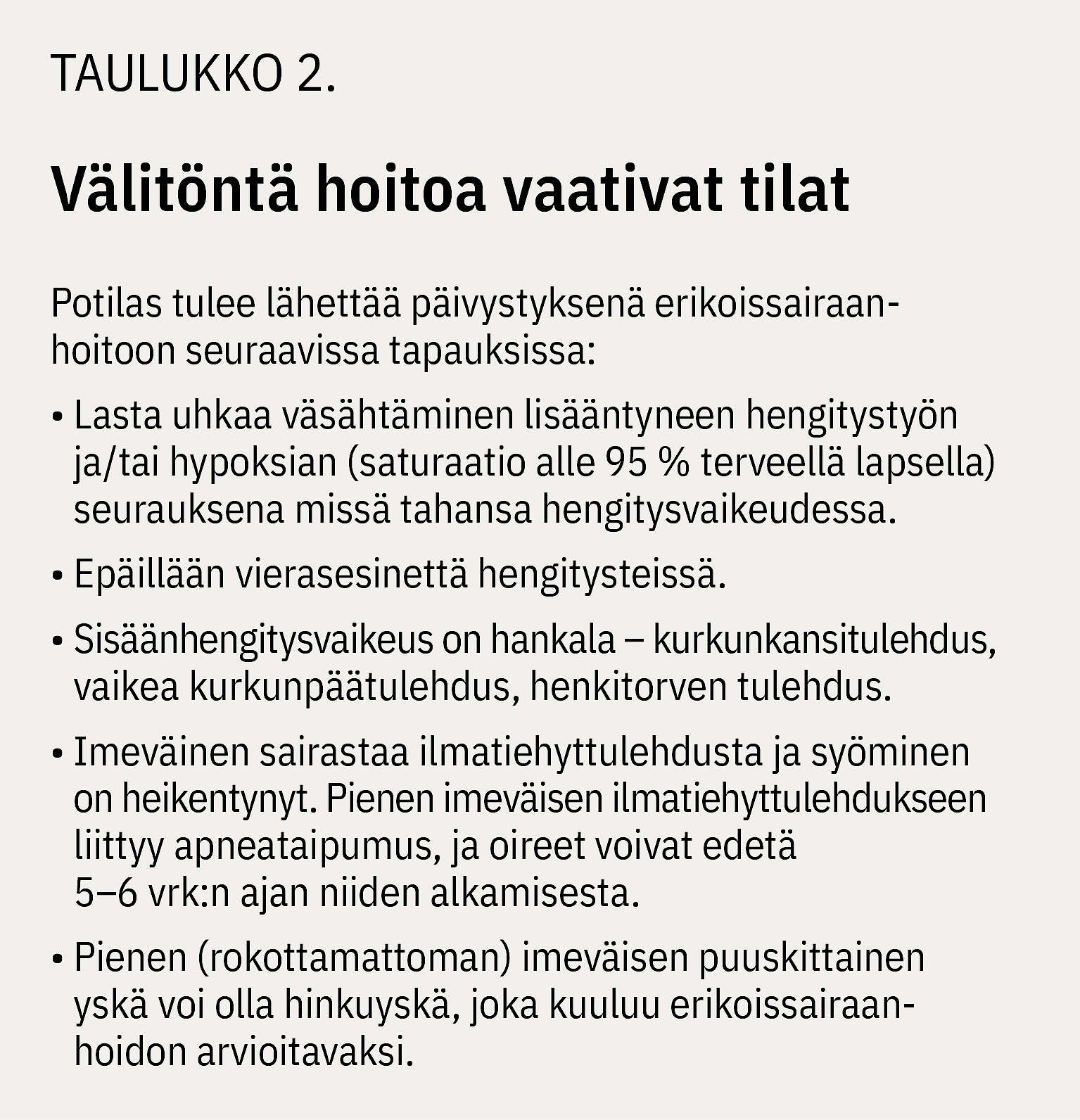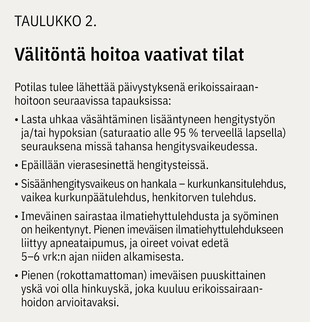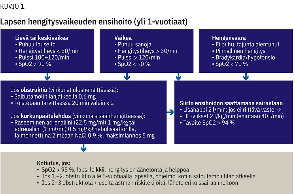 • Vaikeasta hengitysvaikeudesta kärsivä lapsi on lähetettävä päivystyksenä sairaalahoitoon ensihoidon saattamana. Riittävä hengitystuki on varmistettava lisähapella ja tarvittaessa hengitystä avaavalla lääkkeellä.