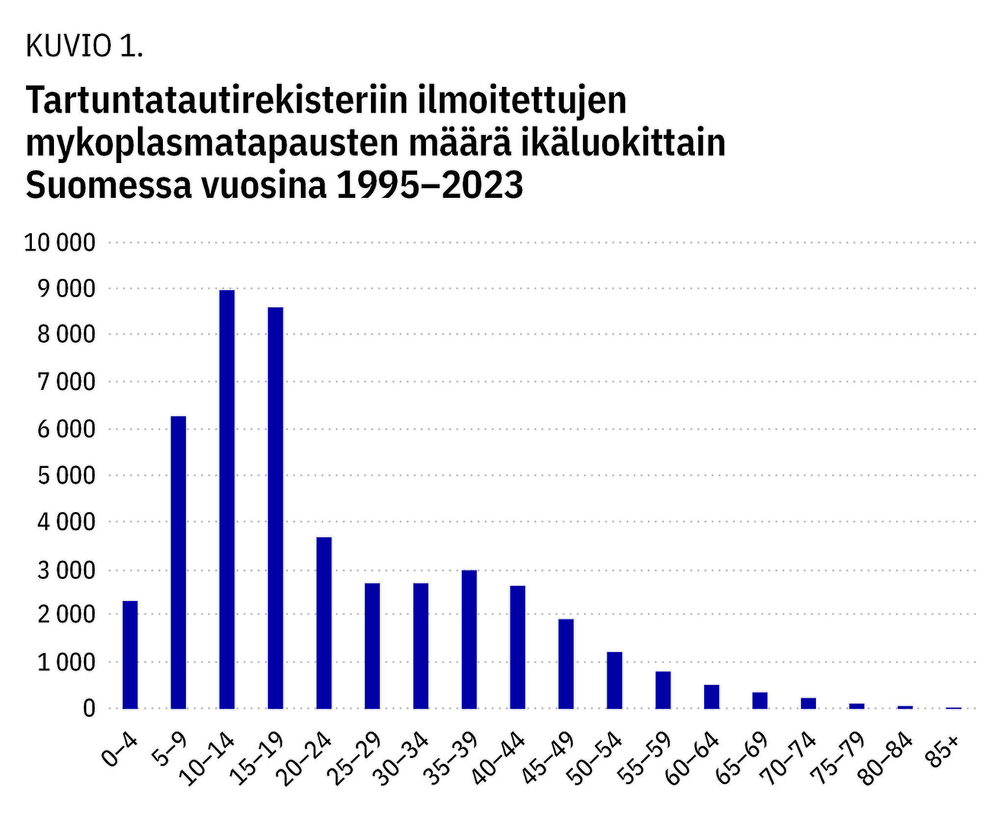 Mykoplasman aiheuttamia infektioita voi esiintyä kaikenikäisillä, mutta ilmaantuvuus on suurin lapsilla ja alle 50-vuotiailla aikuisilla (kuvio 1). Vaikeita oireita ja keuhkonulkoisia ilmentymiä nähdään erityisesti lapsilla, nuorilla aikuisilla ja raskaana olevilla (6,7). Suurimmalla osalla potilaista ei ole perussairauksia.