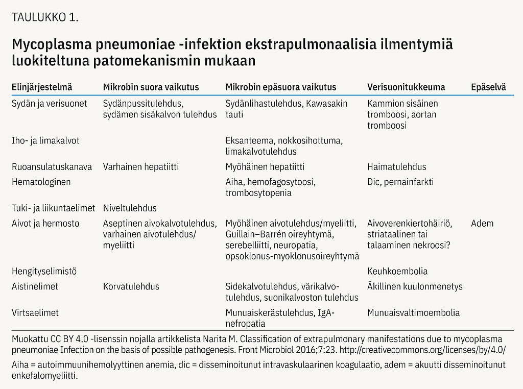 Harvinaisina ilmentyminä on kuvattu niveltulehdusta, munuaiskerästulehdusta, rabdomyolyysia ja sydänkomplikaatioita (21). On mahdollista, että vaikea ja sairaalahoitoa edellyttävä mykoplasmainfektio lisää autoimmuunitautien, kuten lastenreuman ja autoimmuunin kilpirauhastulehduksen, riskiä lapsilla (38).