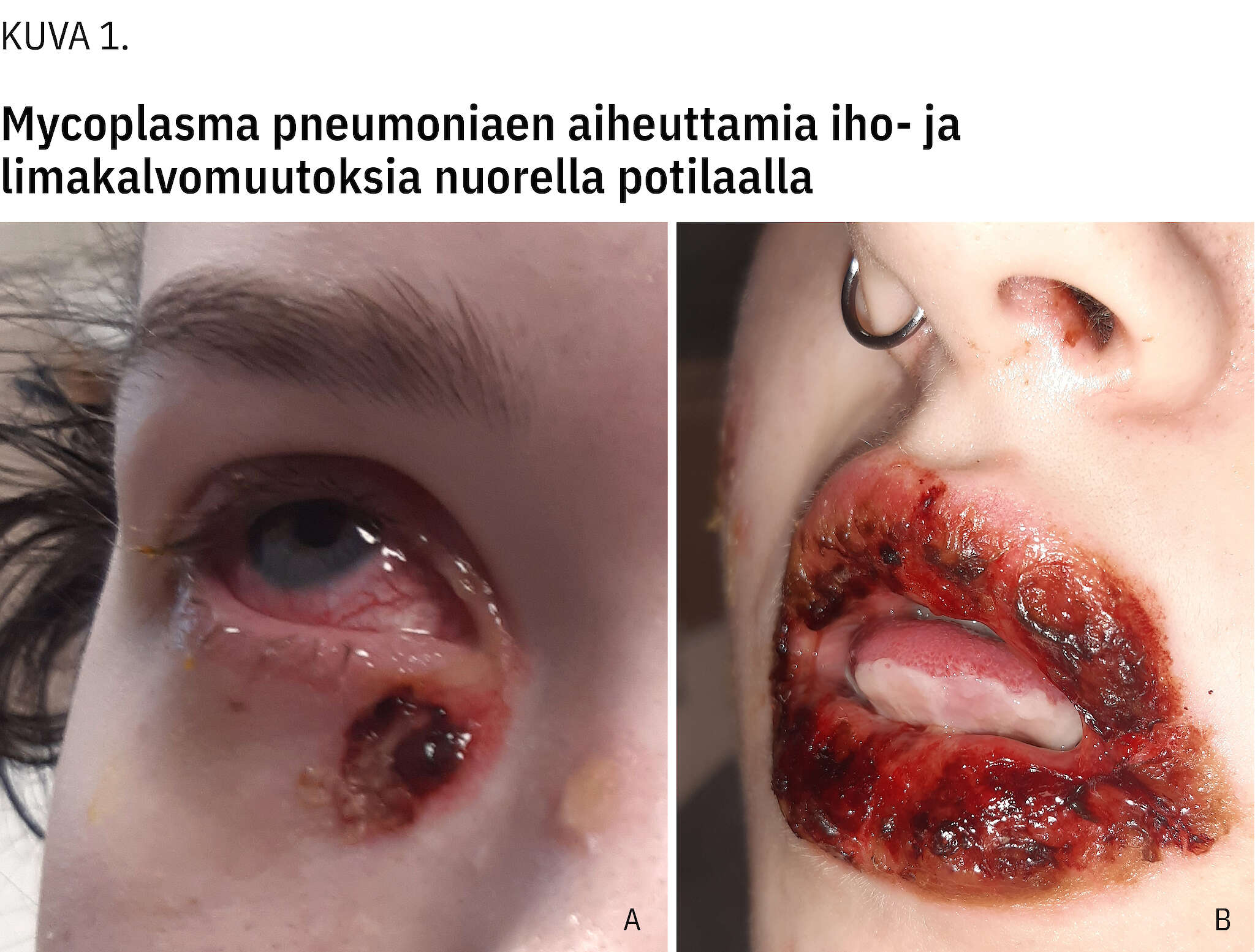 Mukokutaaniset eli iho- tai limakalvo-oireet ovat tavallisimpia mykoplasman ekstrapulmonaalisia ilmentymiä. Niitä tavataan noin 20 %:lla mykoplasman aiheuttamaa keuhkokuumetta sairastavista (14,23,24). Ihoreaktiot vaihtelevat lievästä eksanteemasta ja nokkosihottumasta kyhmyruusuun, kokardileesioihin ja rakkulointiin. Iho-oireisiin voi liittyä muutoksia suun, silmien ja joskus myös genitaalien limakalvoissa (kuva 1 a ja b). Limakalvoreaktioita voi esiintyä ilman ihomuutoksia, erityisesti lapsilla (25).