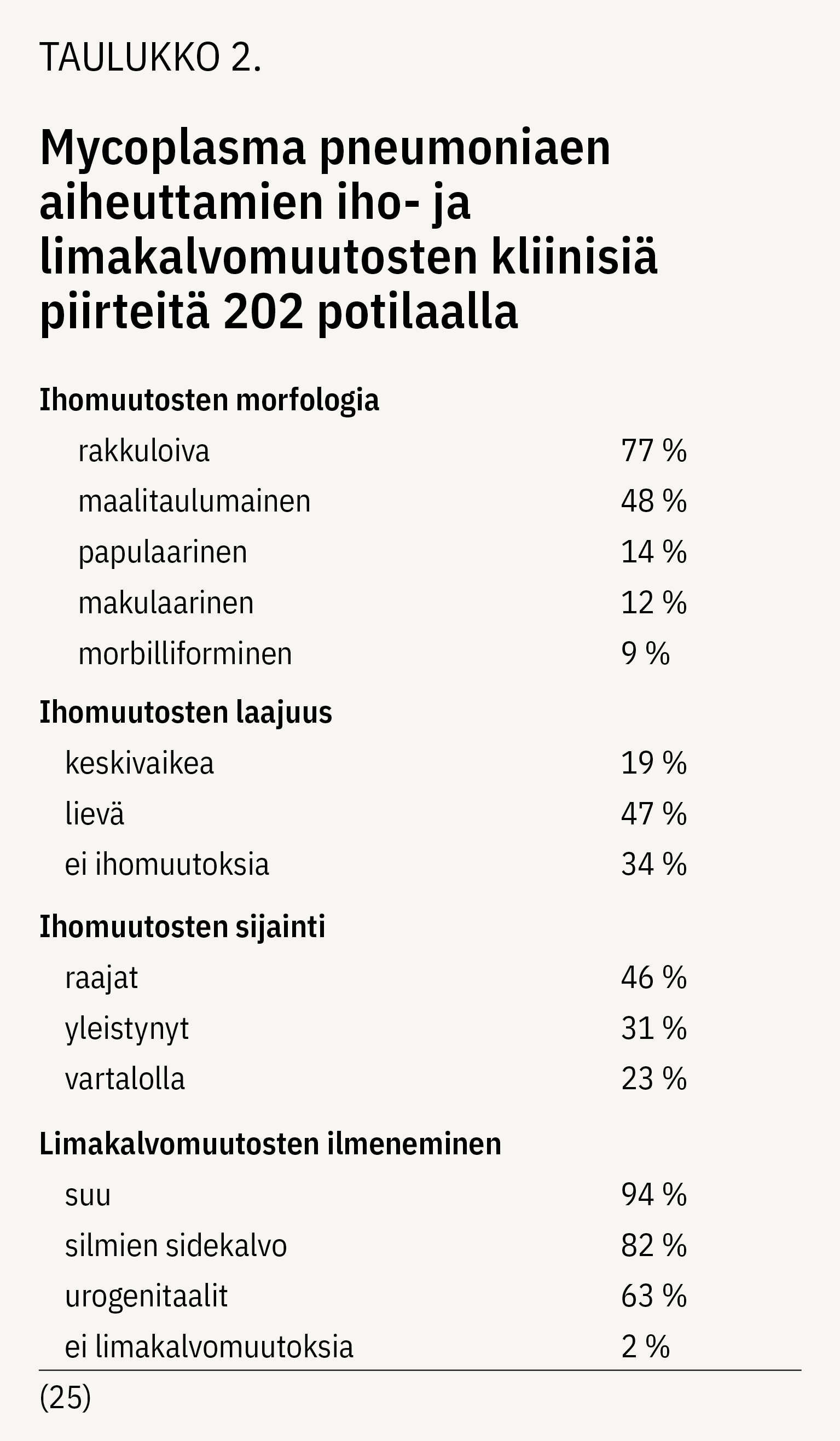 Canavanin ja kumppaneiden vuonna 2015 julkaisemassa systemaattisessa katsauksessa kuvataan 202 kirjallisuudesta löytynyttä potilasta, joilla oli M. pneumoniae -infektion aiheuttamia iho- ja limakalvo-oireita (27). Potilaiden iän keskiarvo oli 11,9 ± 8,8 vuotta, ja 66 % oli poikia tai miehiä. Tyypilliseen taudinkulkuun kuului yskä, väsymys ja kuume sekä noin viikon kuluttua ensi oireista alkavat iho- tai limakalvo-oireet (taulukko 2).