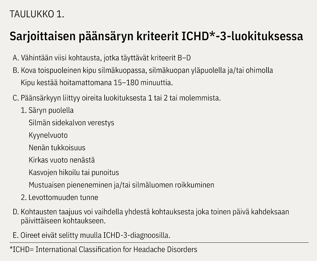 Kansainvälinen päänsärkyluokitus (International Classification of Headache Disorders, ICHD-3) määrittää sarjoittaisen päänsäryn diagnostiset kriteerit (3), jotka on esitetty taulukossa 1. Kohtaukselle on tyypillistä lyhyt kesto, 15 minuutista 3 tuntiin. Oireet ovat usein väistyneet potilaan saapuessa päivystysvastaanotolle, ja diagnoosin viivästyminen on tyypillistä.