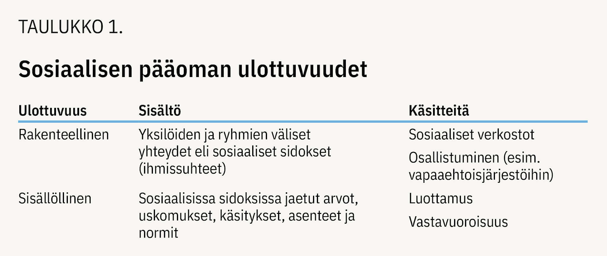 Sosiaalisen pääoman käsitettä alettiin käyttää terveystutkimuksessa 1990-luvulla (8,24). Samalla sosiaalisten verkostojen merkitys nousi uudelleen keskiöön.