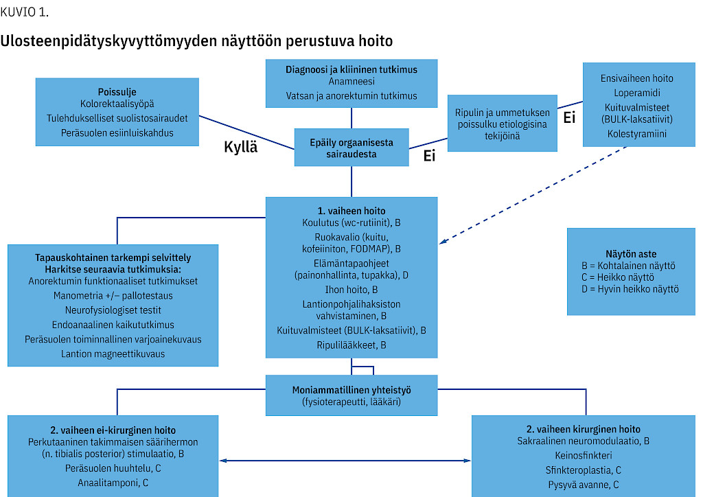 Vastikään on julkaistu päivitetyt näyttöön perustuvat suositukset aikuisten ulosteinkontinenssin hoitoketjusta (16,17).