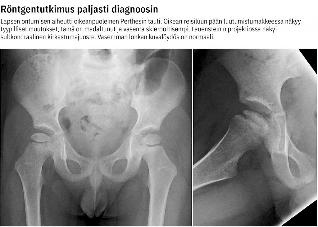 Lastenlääkäri toimi ohjeen mukaan. Röntgenkuva paljasti oikeanpuoleisen Legg–Calvé–Perthesin muutokset reisiluun pään luutumistumakkeessa: tämä oli madaltunut ja vasenta skleroottisempi. Lauensteinin projektiossa näkyi subkondraalinen kirkastumajuoste. Vasemman lonkan kuvalöydös oli normaali.