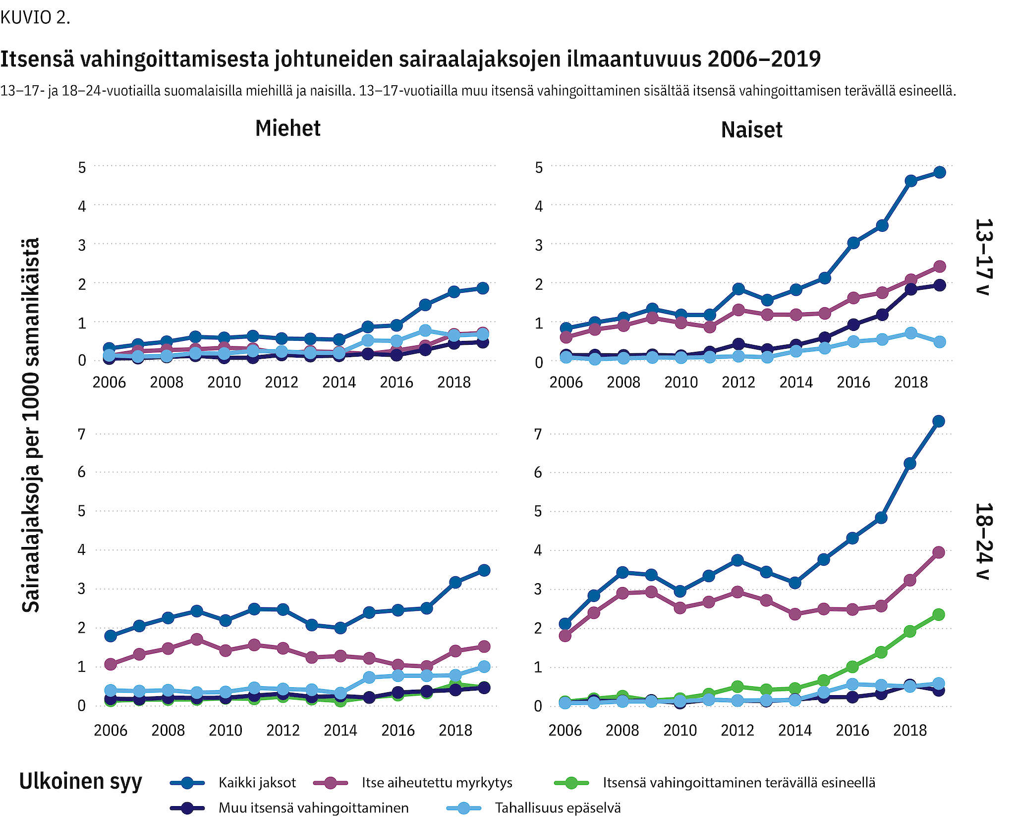 Itsensä vahingoittamisesta johtuneiden sairaalajaksojen määrä on kasvanut seurannan aikana (kuvio 1). Vuoteen 2006 verrattuna 13–17-vuotiailla pojilla ja tytöillä oli noin viisi kertaa enemmän itsensä vahingoittamisesta (mukaan lukien tapahtumat, joissa tahallisuus epäselvä) johtuvia sairaalajaksoja vuonna 2019. Absoluuttinen kasvu 13–17-vuotiailla oli 230 jaksoa pojilla ja 570 tytöillä. Ikäryhmässä 18–24 vuotta absoluuttinen kasvu oli suurempaa (vuonna 2019 miehillä 378 ja naisilla 1 132 jaksoa enemmän kuin vuonna 2006), mutta suhteelliset muutokset olivat maltillisempia johtuen korkeammasta lähtötasosta.