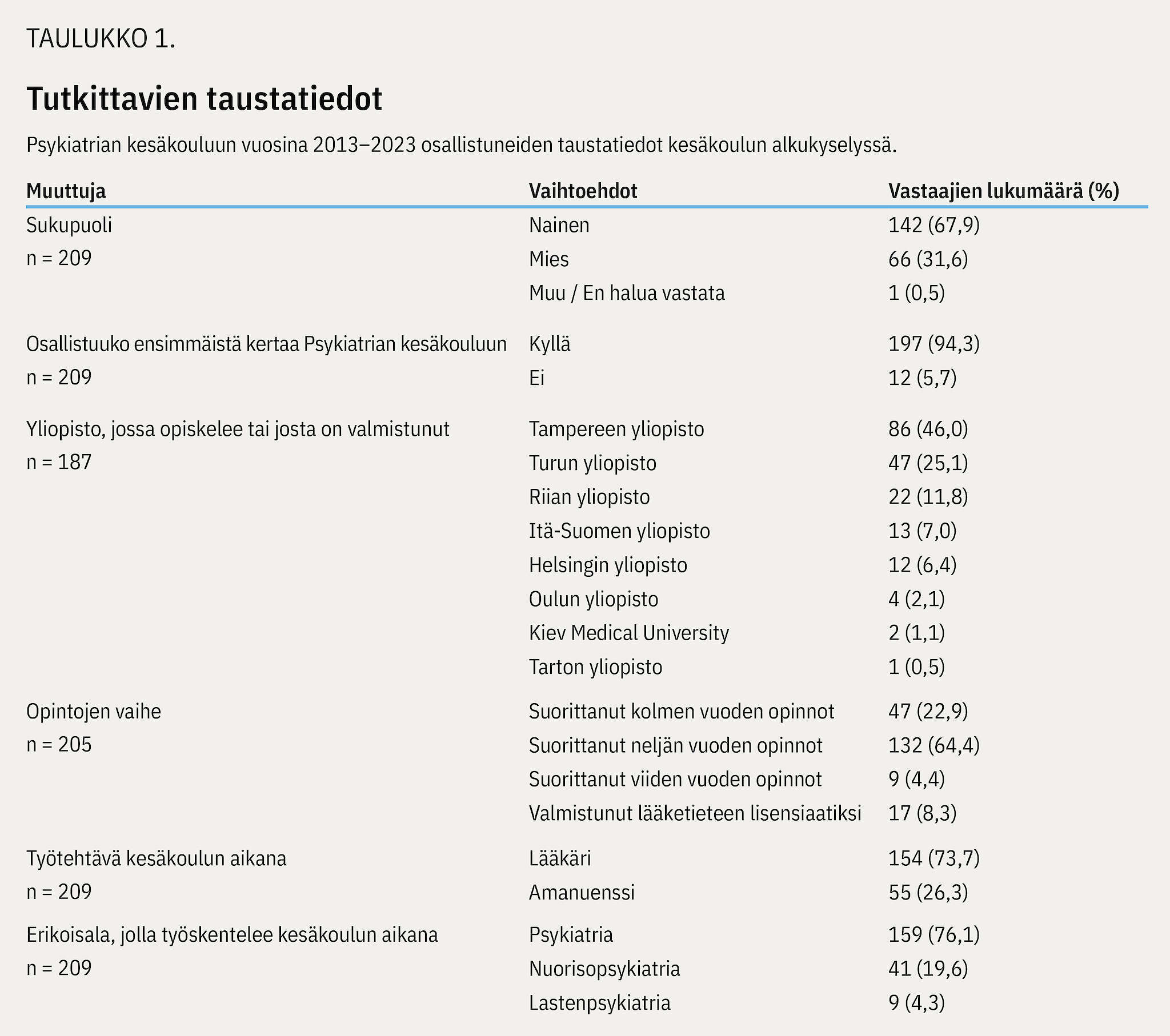 Alkukyselyssä kerättiin tiedot sukupuolesta, iästä, opiskelupaikasta, opintojen vaiheesta, työtehtävästä, työpisteestä ja siitä, osallistuiko tutkittava ensimmäistä kertaa psykiatrian kesäkouluun. Seurantakyselyssä selvitettiin, onko tutkittava valmistunut lääkäriksi, hänen kokemuksensa kesäkoulusta (hyvin negatiivinen/negatiivinen/en osaa sanoa/positiivinen/hyvin positiivinen), erikoistuuko tutkittava ajankohtaisesti psykiatrian alalle ja jos erikoistuu, 1) mille erikoisalalle ja 2) mikä kesäkoulun merkitys oli erikoistumispäätöksessä (merkittävä/jonkin verran/ei lainkaan).