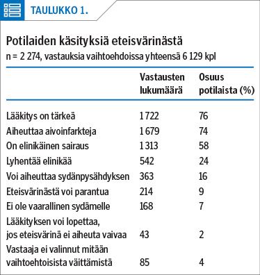 Sydänliiton toteuttamassa kyselyssä tavoitettiin suuri joukko suomalaisia eteisvärinäpotilaita. Suurin osa oli oireettomia tai lieväoireisia rytmihäiriön suhteen. Lähes kaikki olivat saaneet tietoa lääkäriltä, mutta puutteita tiedonsaannissa koettiin paljon ja tukea koettiin tarvittavan enemmän. Naiset olivat miehiä oireisempia ja tyytymättömämpiä saamaansa tukeen.