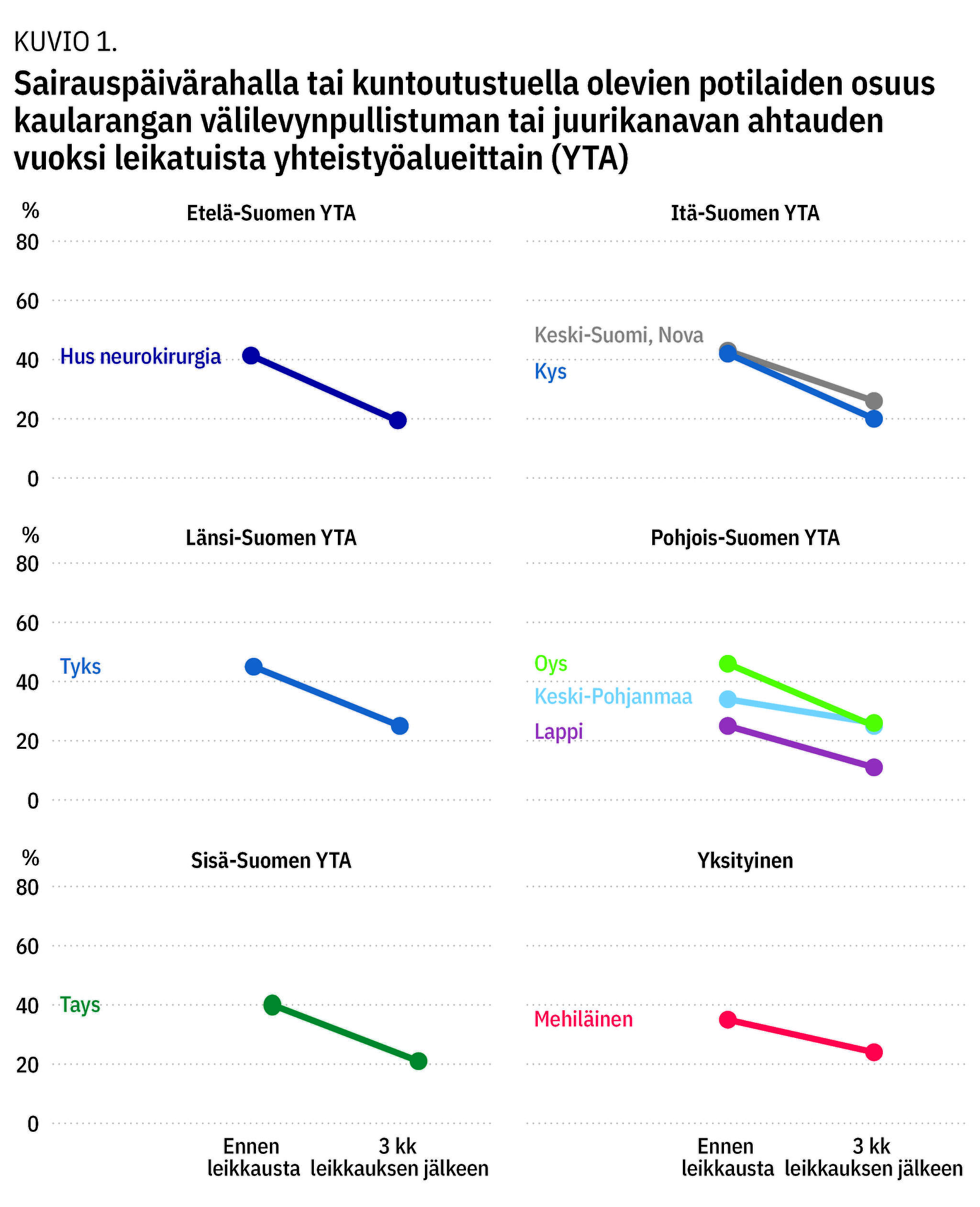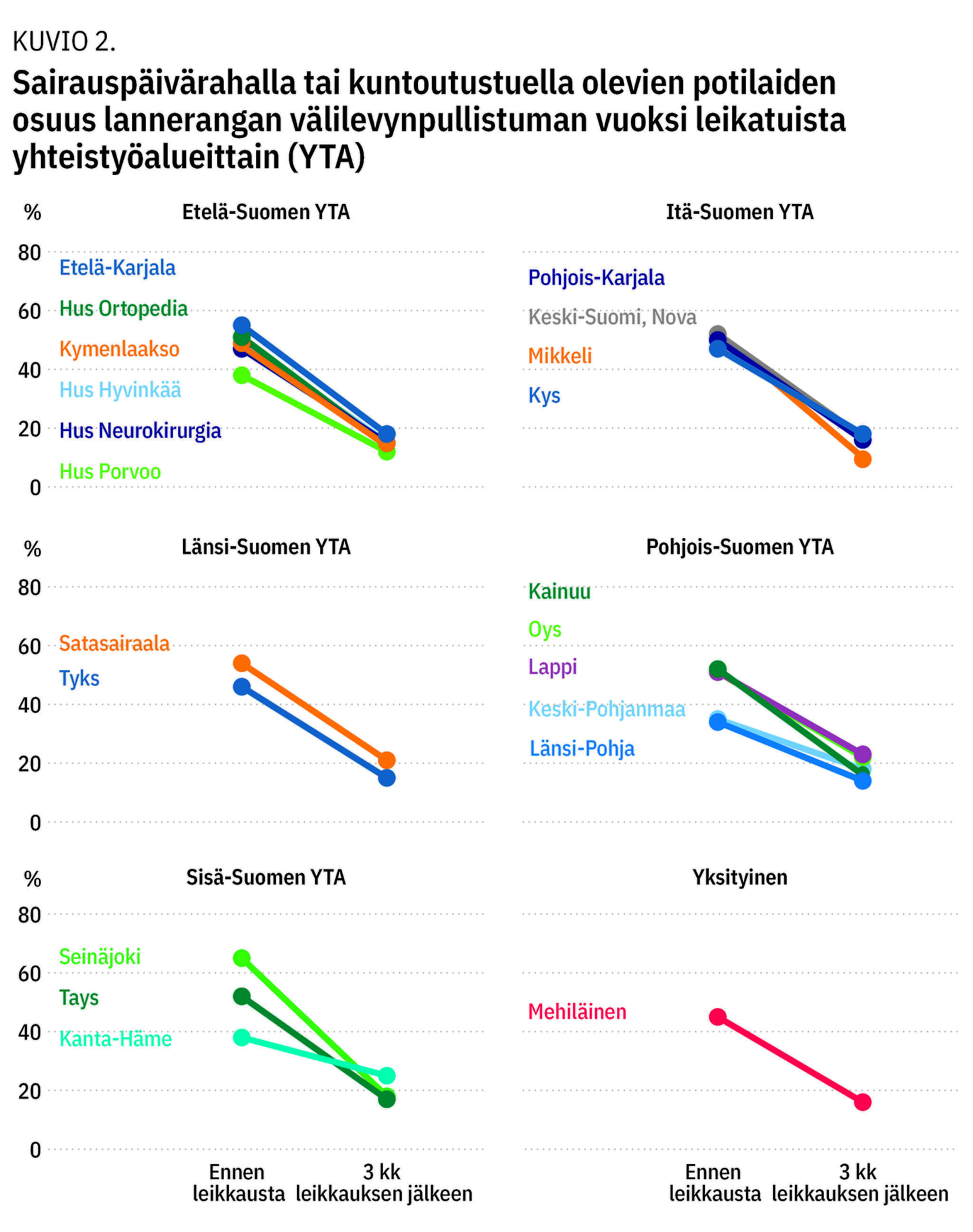 Raportin mukaan yhteensä 8 117 potilasta oli käynyt lannerangan leikkauksessa välilevynpullistuman vuoksi. Ennen leikkausta sairauspäivärahalla tai kuntoutustuella olevien osuus leikkaukseen tulleista potilaista oli koko maassa keskimäärin 49 %. Osuus oli suurin Seinäjoen keskussairaalassa (65 % potilaista) ja pienin Länsi-Pohjan keskussairaalassa (34 %).